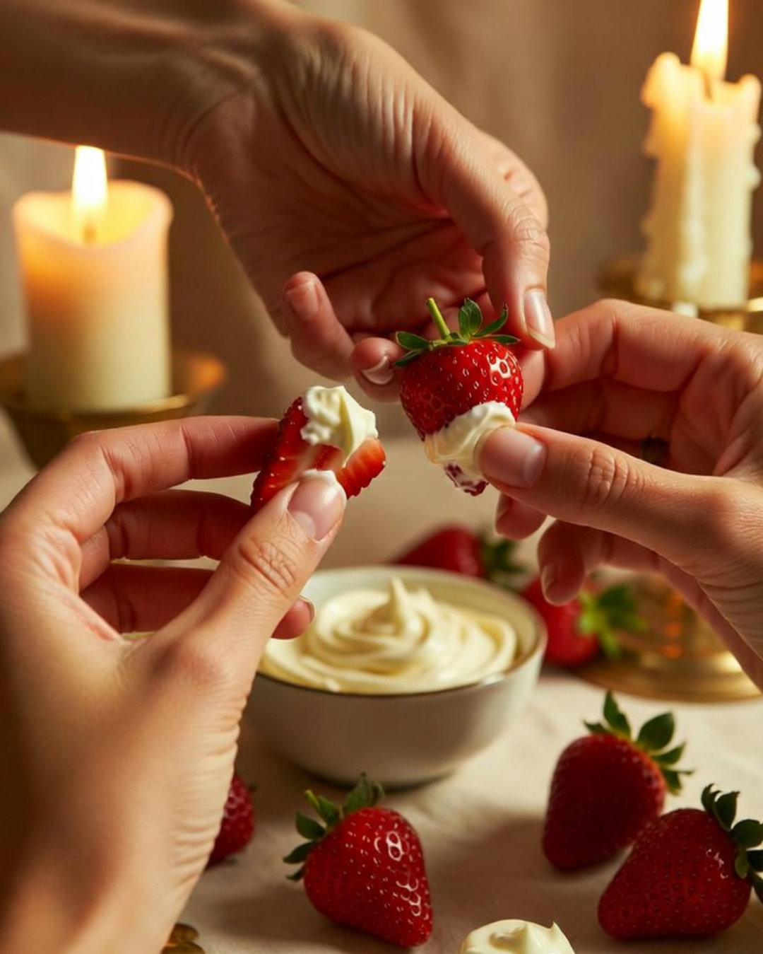 Erdbeeren + Sahne (der Sahne-Kracher!), Fingerfood-Style, Kerzen, teilen & naschen – verspielt und sinnlich.