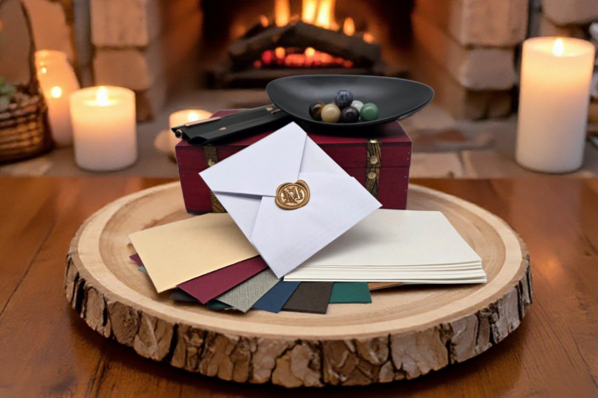 7 Marmormurmeln, 7 Kuverts + Karten + Stifte, versiegelter Brief, schwarze Schale, Schatztruhe, 45-Min-Audio via QR-Code