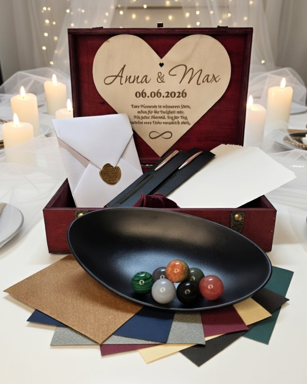 Heute öffnet sich seine Truhe für euch – als komplettes Hochzeits-Bundle: Magie der Momente (die Original-Box) + Eure Traumhochzeit (das exklusive Ergänzungsset, speziell für euren Hochzeitstag gestaltet). Zusammen bilden sie die ideale Zeitkapsel für Brautpaare 2026 – perfekt als Hochzeitsgeschenk, Alternative zum Gästebuch oder als emotionale Erinnerung an den schönsten Tag eures Lebens.